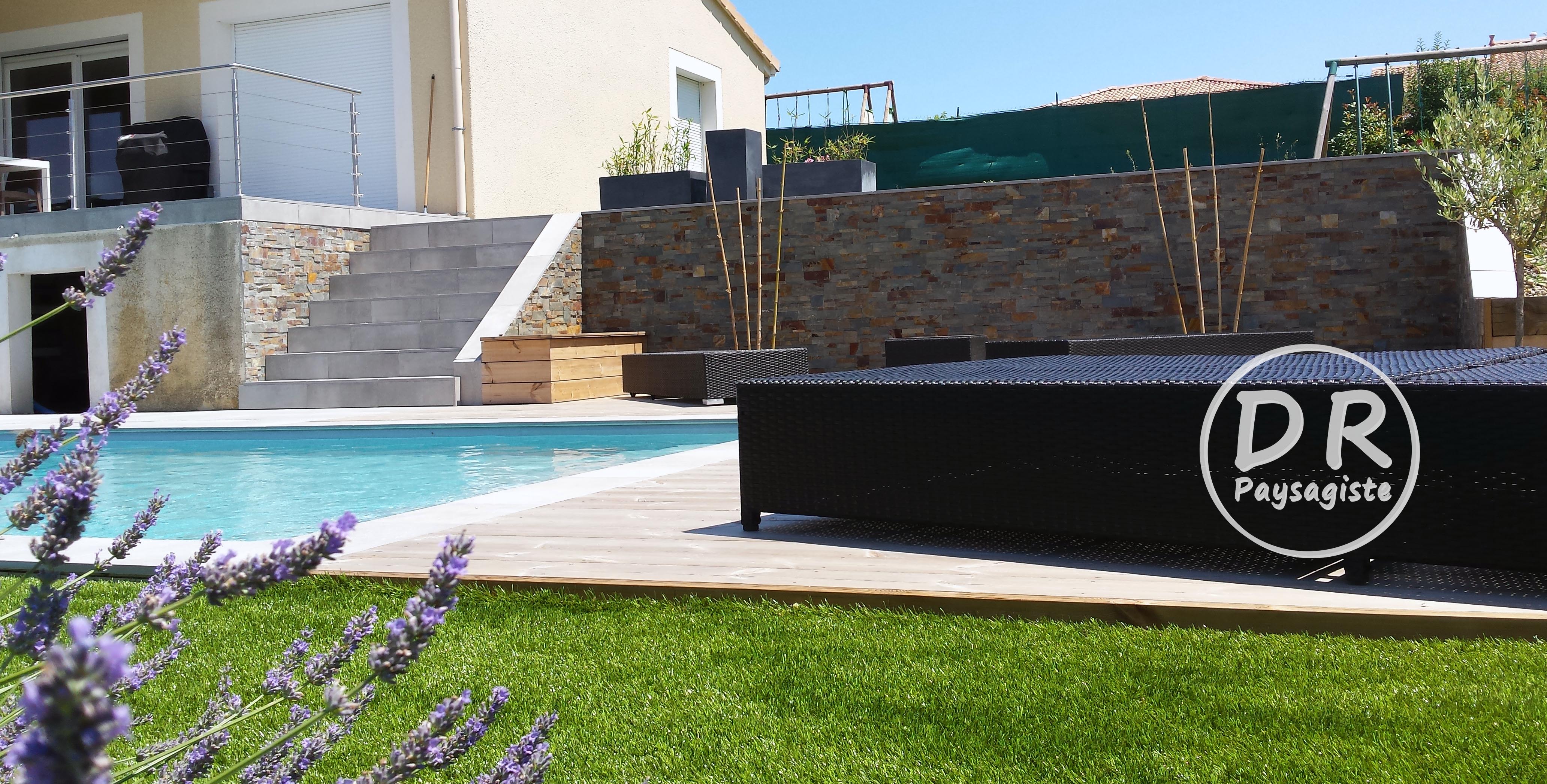 terrasse gres cérame et thermo-pin, parement schiste oxydé